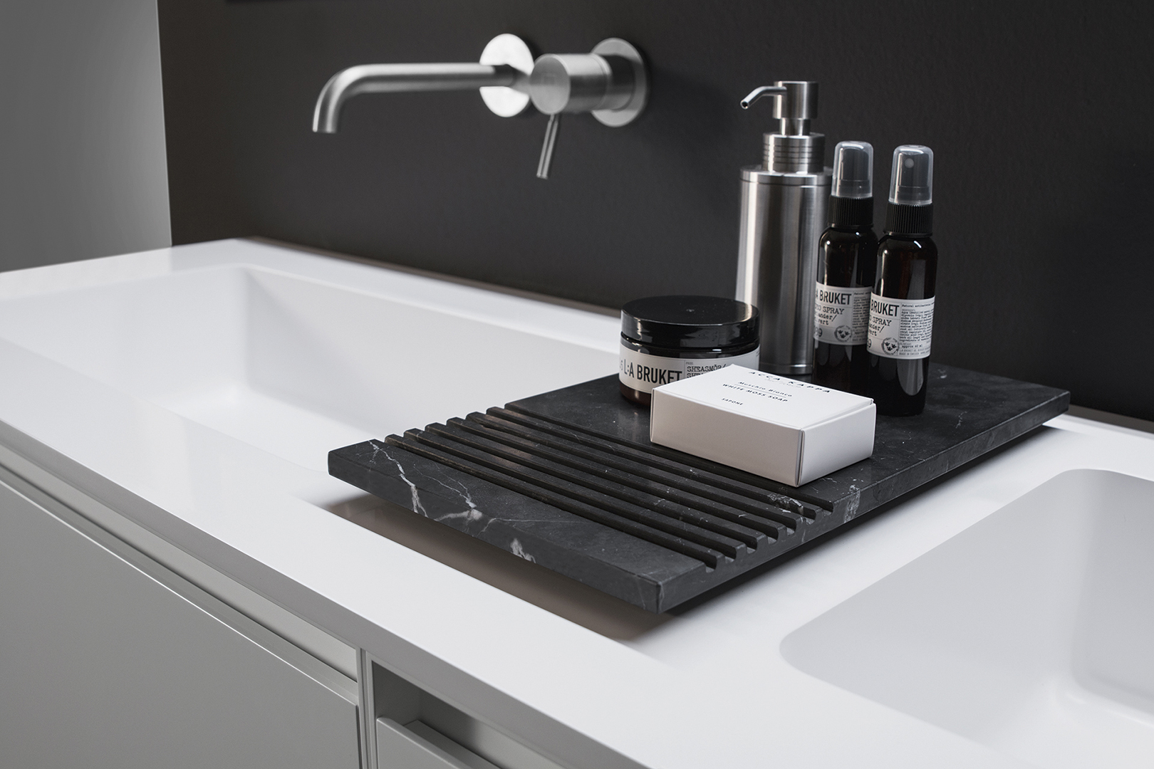 Tray for knickknacks available in Monolith, marble and Wood. The Wood version does not have a grooved surface on the top.