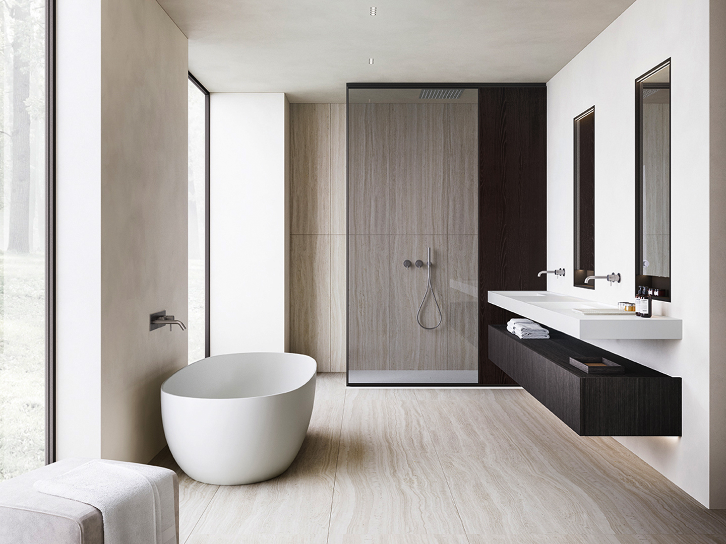 Il sistema prevede anche moduli con vetro verniciato dal lato interno e rivestimento sul lato esterno in legno, specchio o i solid-surface prodotti da Casabath: Monolith, Velvet Stone e Solid Granite. Questi moduli possono essere collegati a moduli a vetro per soluzioni particolari, quando ad esempio si voglia separare la zona dei sanitari dal resto del bagno o tra il bagno e una camera o un guardaroba.